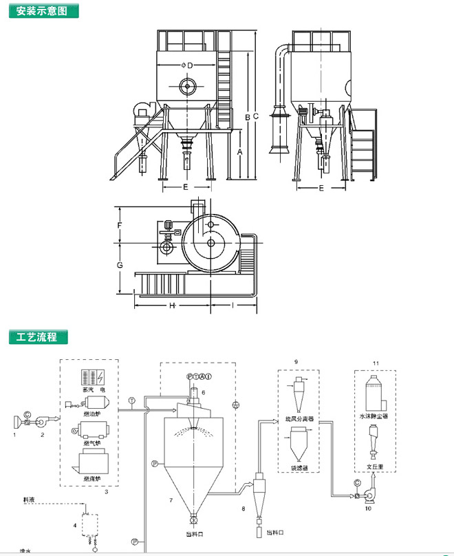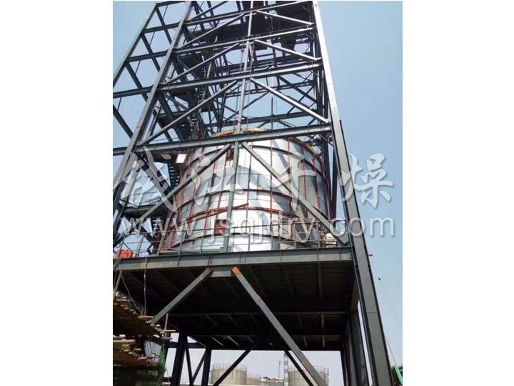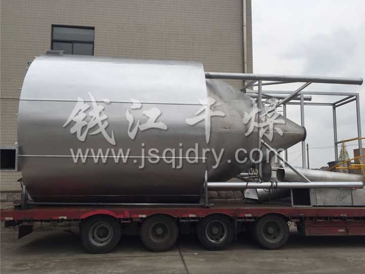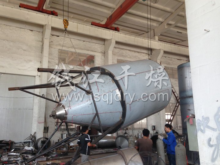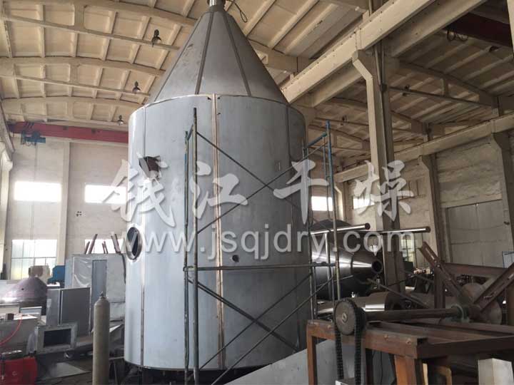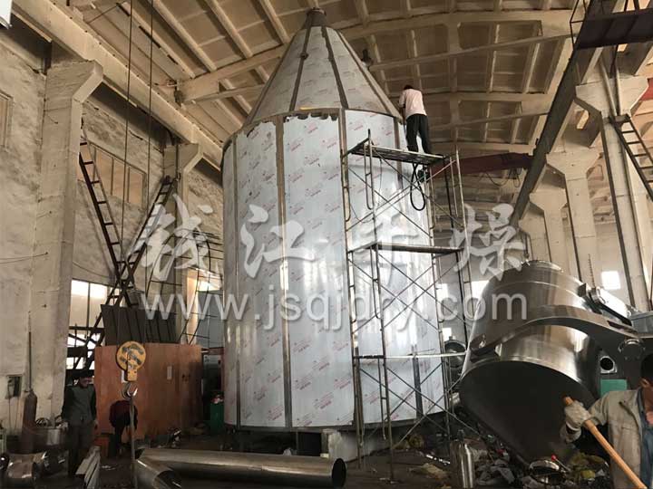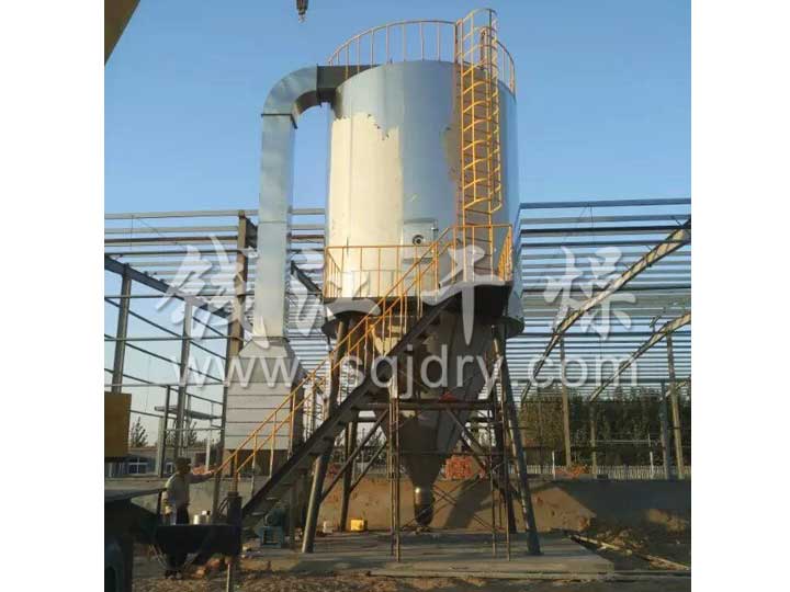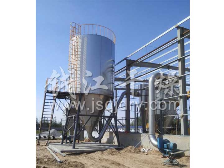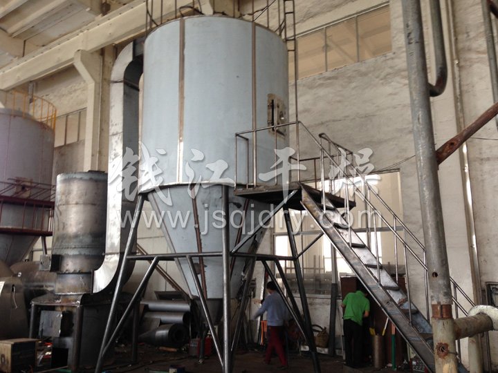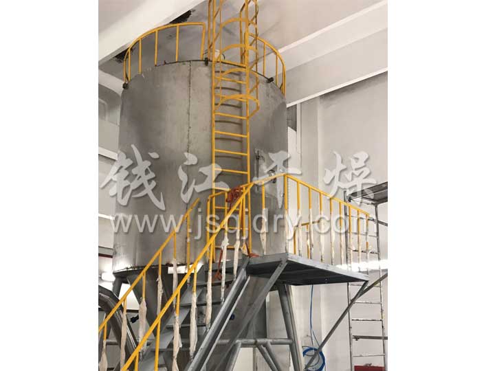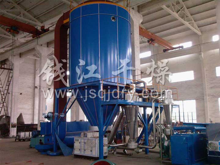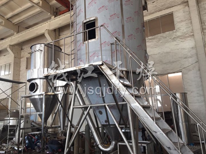 空氣經過濾和加熱,進入干燥器頂部空氣分配器,熱空氣呈螺旋狀均勻地進入干燥室。料液經塔體頂部的高速離心霧化器,(旋轉)噴霧成極細微的霧狀液珠,與熱空氣并流接觸在極短的時間內可干燥為成品。成品連續地由干燥塔底部和旋風分離器中輸出,廢氣由風機排空。