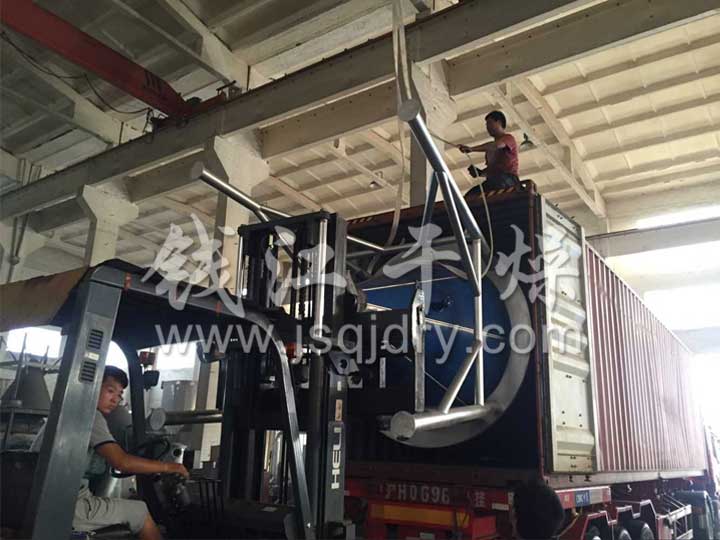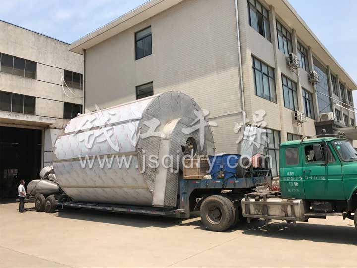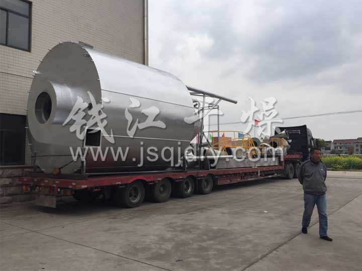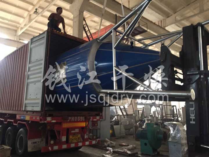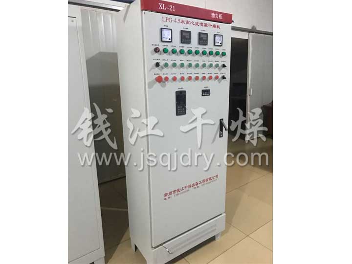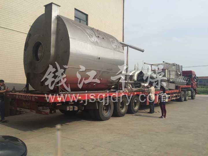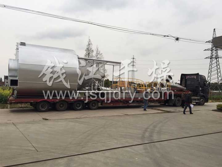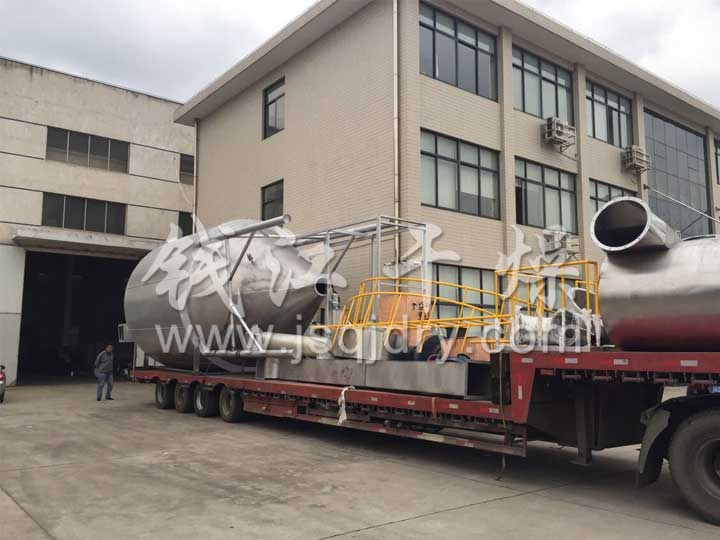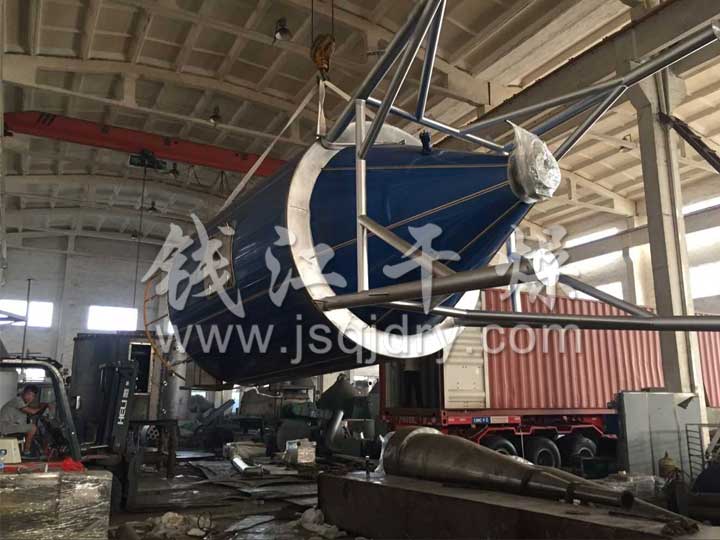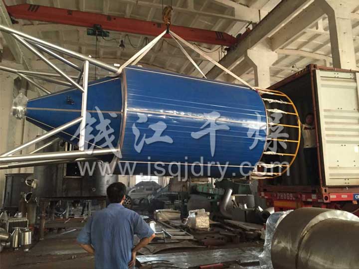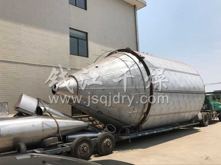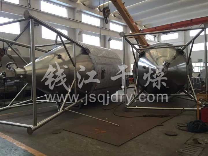 空氣經過濾和加熱,進入干燥器頂部空氣分配器,熱空氣呈螺旋狀均勻地進入干燥室。料液經塔體頂部的高速離心霧化器,(旋轉)噴霧成極細微的霧狀液珠,與熱空氣并流接觸在極短的時間內可干燥為成品。成品連續地由干燥塔底部和旋風分離器中輸出,廢氣由風機排空。